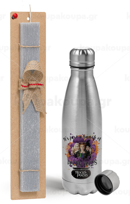 Hocus Pocus, Πασχαλινή Λαμπάδα με μεταλλικό παγούρι Inox (750ml) & κερί αρωματικό πλακέ (30cm) (ΓΚΡΙ)