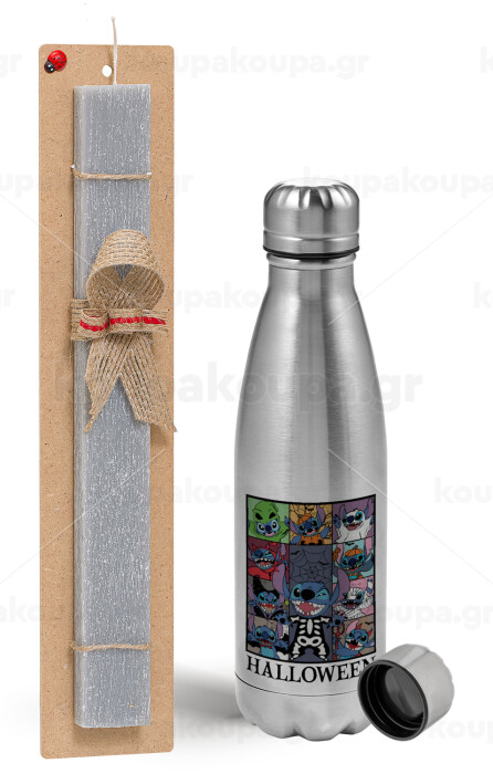 Stitch Halloween, Πασχαλινή Λαμπάδα με μεταλλικό παγούρι Inox (750ml) & κερί αρωματικό πλακέ (30cm) (ΓΚΡΙ)
