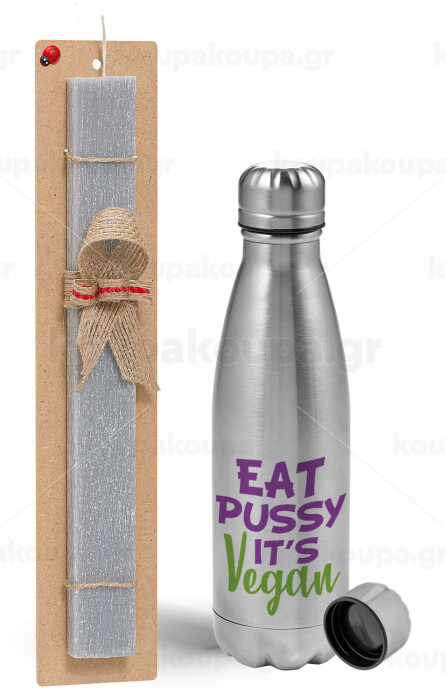 EAT pussy it's vegan, Πασχαλινή Λαμπάδα με μεταλλικό παγούρι Inox (750ml) & κερί αρωματικό πλακέ (30cm) (ΓΚΡΙ)