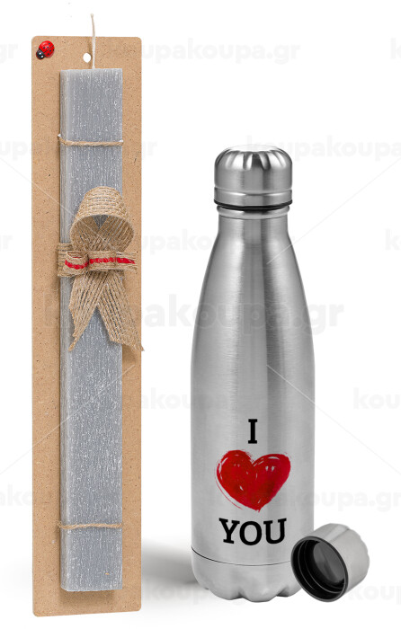 I Love You, Πασχαλινή Λαμπάδα με μεταλλικό παγούρι Inox (750ml) & κερί αρωματικό πλακέ (30cm) (ΓΚΡΙ)