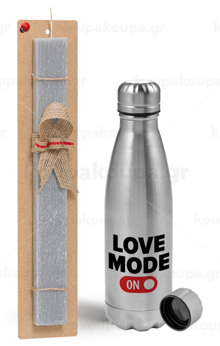LOVE MODE ON, Πασχαλινή Λαμπάδα με μεταλλικό παγούρι Inox (750ml) & κερί αρωματικό πλακέ (30cm) (ΓΚΡΙ)