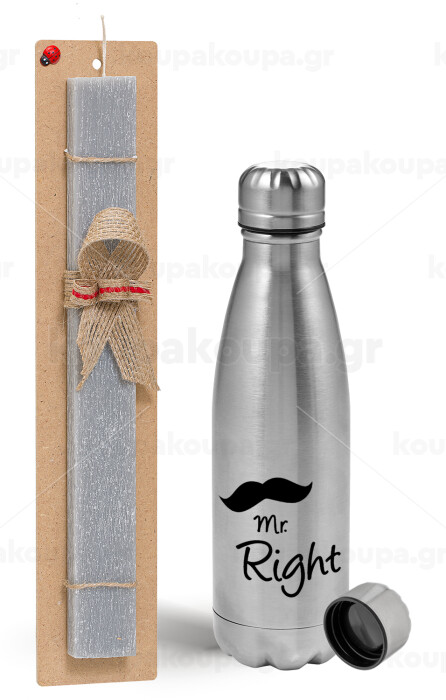 Mr right Mustache, Πασχαλινή Λαμπάδα με μεταλλικό παγούρι Inox (750ml) & κερί αρωματικό πλακέ (30cm) (ΓΚΡΙ)