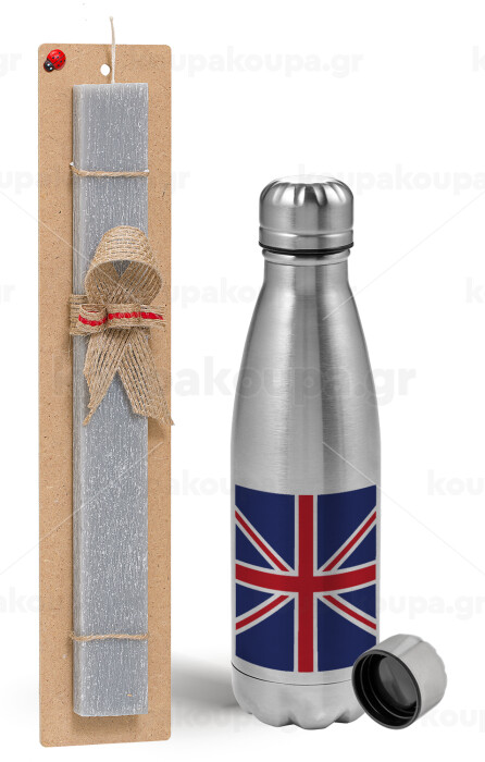 Σημαία Αγγλίας UK, Πασχαλινή Λαμπάδα με μεταλλικό παγούρι Inox (750ml) & κερί αρωματικό πλακέ (30cm) (ΓΚΡΙ)
