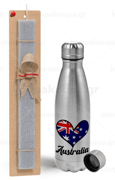 Australia flag, Πασχαλινή Λαμπάδα με μεταλλικό παγούρι Inox (750ml) & κερί αρωματικό πλακέ (30cm) (ΓΚΡΙ)