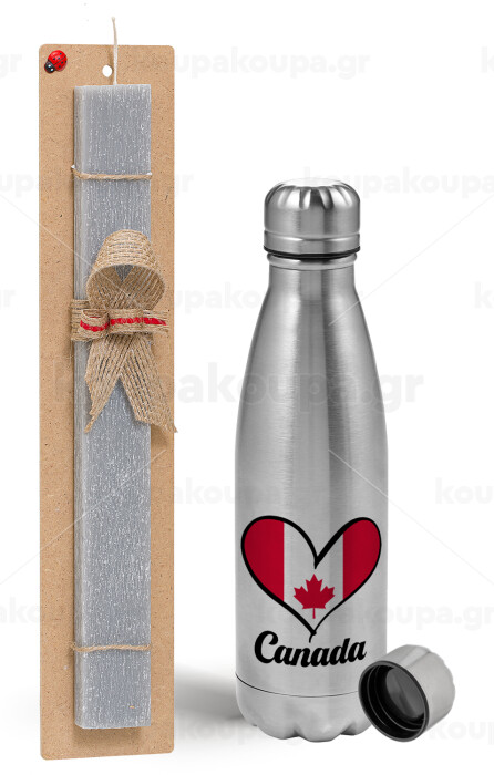 Canada flag, Πασχαλινή Λαμπάδα με μεταλλικό παγούρι Inox (750ml) & κερί αρωματικό πλακέ (30cm) (ΓΚΡΙ)