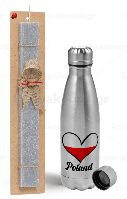 Poland flag, Πασχαλινή Λαμπάδα με μεταλλικό παγούρι Inox (750ml) & κερί αρωματικό πλακέ (30cm) (ΓΚΡΙ)
