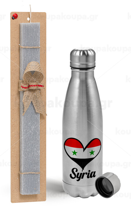 Syria flag, Πασχαλινή Λαμπάδα με μεταλλικό παγούρι Inox (750ml) & κερί αρωματικό πλακέ (30cm) (ΓΚΡΙ)
