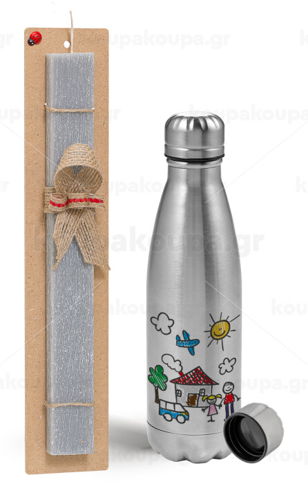 Παιδική ζωγραφιά, Πασχαλινή Λαμπάδα με μεταλλικό παγούρι Inox (750ml) & κερί αρωματικό πλακέ (30cm) (ΓΚΡΙ)