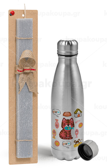 Cats and Fishes, Πασχαλινή Λαμπάδα με μεταλλικό παγούρι Inox (750ml) & κερί αρωματικό πλακέ (30cm) (ΓΚΡΙ)