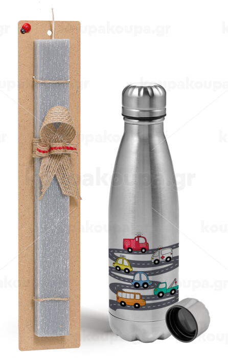 Hand drawn childish set with cars, Πασχαλινή Λαμπάδα με μεταλλικό παγούρι Inox (750ml) & κερί αρωματικό πλακέ (30cm) (ΓΚΡΙ)
