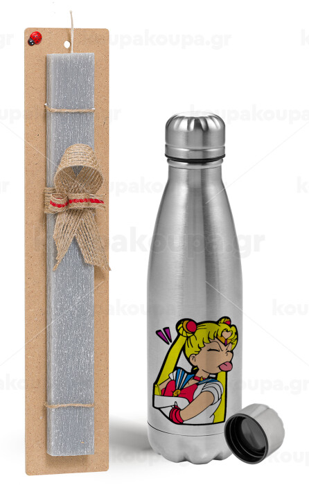 Sailor Moon, Πασχαλινή Λαμπάδα με μεταλλικό παγούρι Inox (750ml) & κερί αρωματικό πλακέ (30cm) (ΓΚΡΙ)