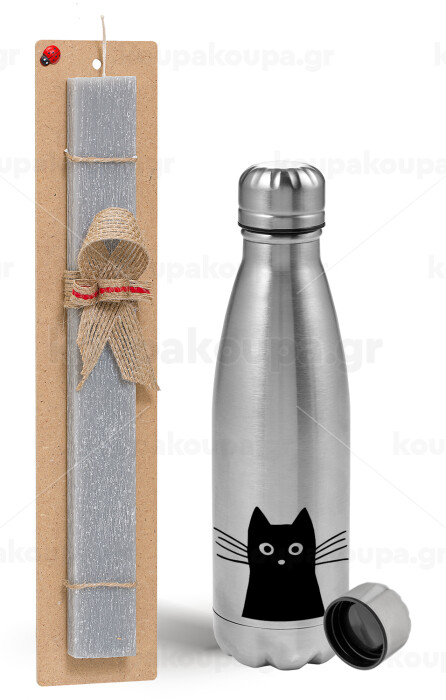 Μαύρη γάτα, Πασχαλινή Λαμπάδα με μεταλλικό παγούρι Inox (750ml) & κερί αρωματικό πλακέ (30cm) (ΓΚΡΙ)