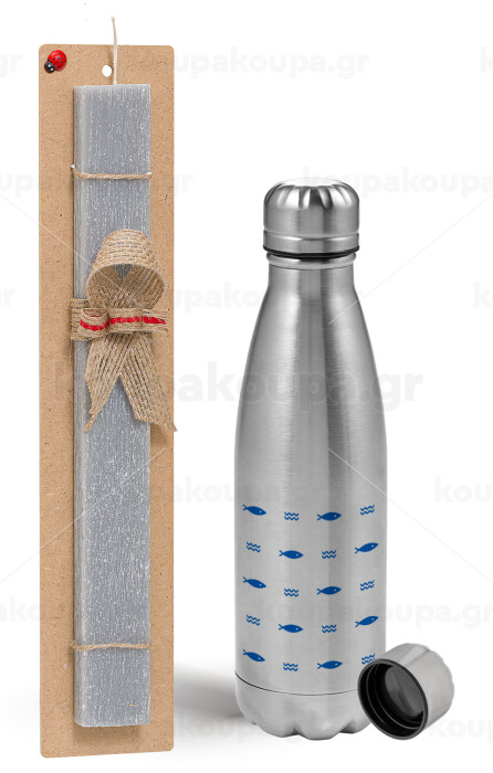 Ψαράκια, Πασχαλινή Λαμπάδα με μεταλλικό παγούρι Inox (750ml) & κερί αρωματικό πλακέ (30cm) (ΓΚΡΙ)