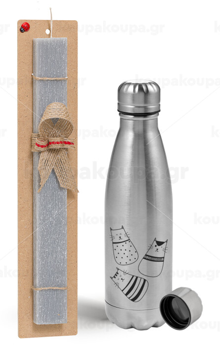 Cute cats, Πασχαλινή Λαμπάδα με μεταλλικό παγούρι Inox (750ml) & κερί αρωματικό πλακέ (30cm) (ΓΚΡΙ)