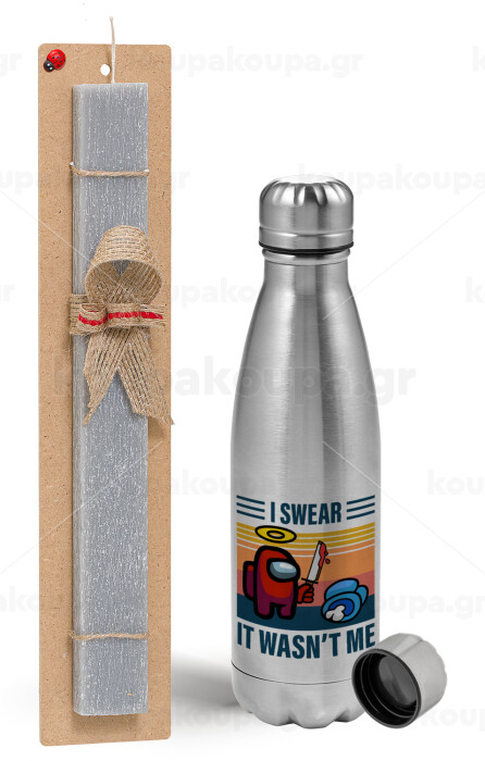 Among us, I swear it wasn't me, Πασχαλινή Λαμπάδα με μεταλλικό παγούρι Inox (750ml) & κερί αρωματικό πλακέ (30cm) (ΓΚΡΙ)