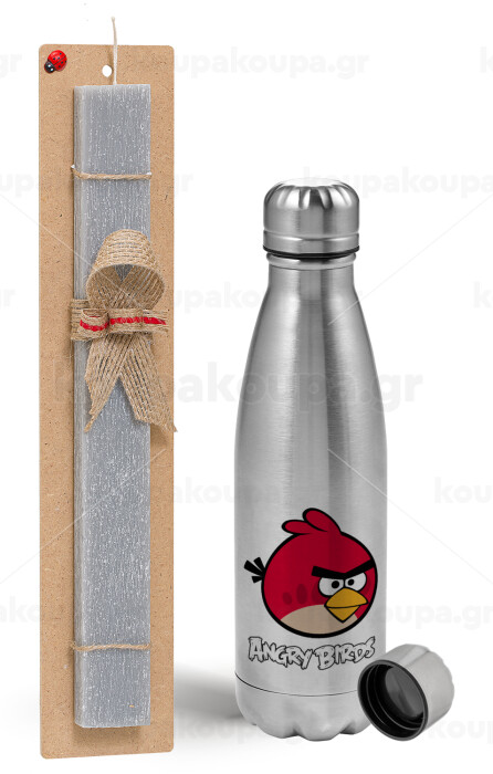 Angry birds Terence, Πασχαλινή Λαμπάδα με μεταλλικό παγούρι Inox (750ml) & κερί αρωματικό πλακέ (30cm) (ΓΚΡΙ)