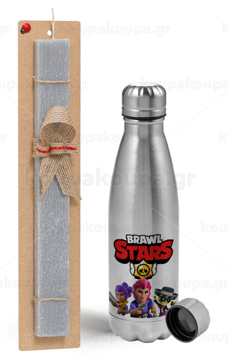 Brawl Stars Blue, Πασχαλινή Λαμπάδα με μεταλλικό παγούρι Inox (750ml) & κερί αρωματικό πλακέ (30cm) (ΓΚΡΙ)