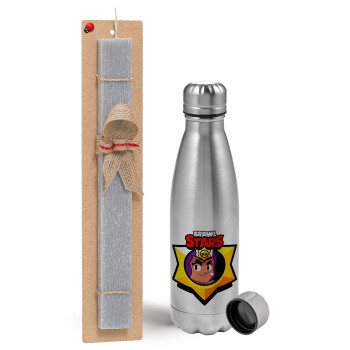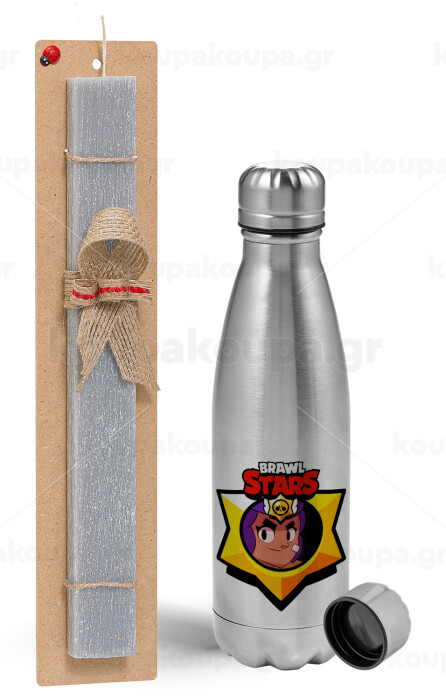 Brawl Stars Shelly, Πασχαλινή Λαμπάδα με μεταλλικό παγούρι Inox (750ml) & κερί αρωματικό πλακέ (30cm) (ΓΚΡΙ)