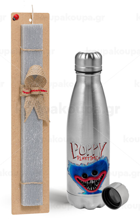Poppy Playtime Huggy wuggy, Πασχαλινή Λαμπάδα με μεταλλικό παγούρι Inox (750ml) & κερί αρωματικό πλακέ (30cm) (ΓΚΡΙ)