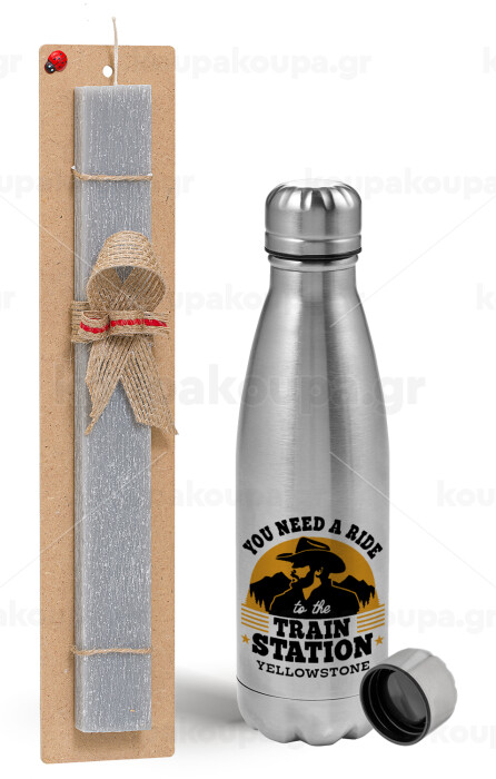 You need a ride to the train station, Πασχαλινή Λαμπάδα με μεταλλικό παγούρι Inox (750ml) & κερί αρωματικό πλακέ (30cm) (ΓΚΡΙ)