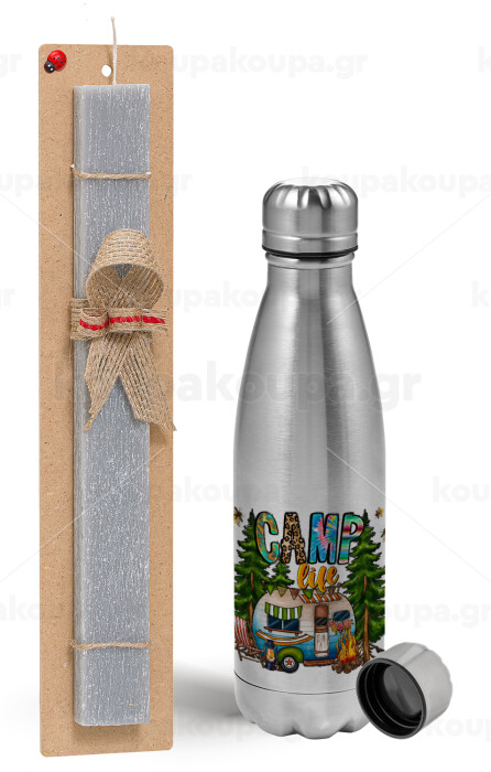 Camp Life, Πασχαλινή Λαμπάδα με μεταλλικό παγούρι Inox (750ml) & κερί αρωματικό πλακέ (30cm) (ΓΚΡΙ)