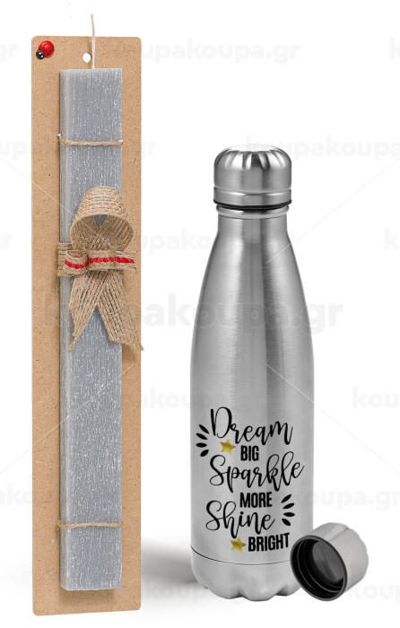 Dream big, Sparkle more, Shine bright, Πασχαλινή Λαμπάδα με μεταλλικό παγούρι Inox (750ml) & κερί αρωματικό πλακέ (30cm) (ΓΚΡΙ)