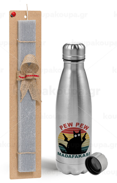 PEW PEW madafakas, Πασχαλινή Λαμπάδα με μεταλλικό παγούρι Inox (750ml) & κερί αρωματικό πλακέ (30cm) (ΓΚΡΙ)