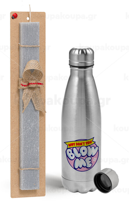 Why Don't You Blow Me Funny, Πασχαλινή Λαμπάδα με μεταλλικό παγούρι Inox (750ml) & κερί αρωματικό πλακέ (30cm) (ΓΚΡΙ)