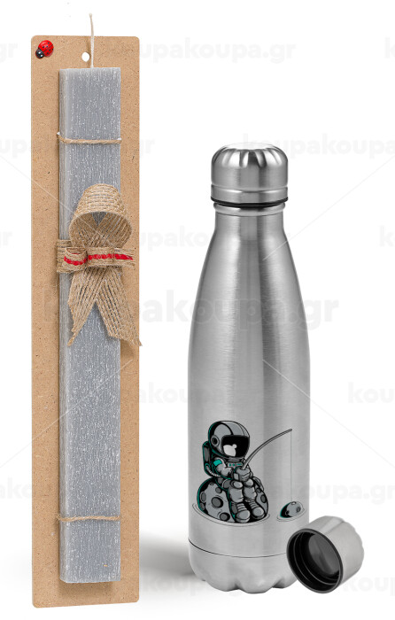 Αστροναύτης ψαρεύει στο διάστημα, Πασχαλινή Λαμπάδα με μεταλλικό παγούρι Inox (750ml) & κερί αρωματικό πλακέ (30cm) (ΓΚΡΙ)