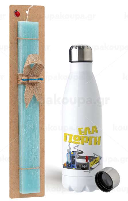 Έλα Γιώργη, πω πω μια στροφάρα, Πασχαλινή Λαμπάδα με μεταλλικό παγούρι ανοξείδωτο (750ml) & κερί αρωματικό πλακέ (30cm) (ΤΙΡΚΟΥΑΖ)