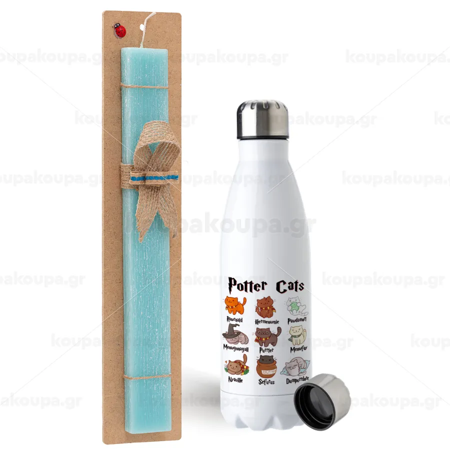 Potter Cats, Πασχαλινή Λαμπάδα με μεταλλικό παγούρι ανοξείδωτο (750ml) & κερί αρωματικό πλακέ (30cm) (ΤΙΡΚΟΥΑΖ)