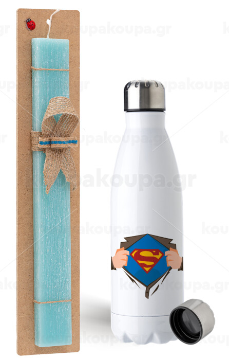Superman hands, Πασχαλινή Λαμπάδα με μεταλλικό παγούρι ανοξείδωτο (750ml) & κερί αρωματικό πλακέ (30cm) (ΤΙΡΚΟΥΑΖ)