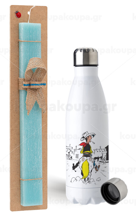 Λούκυ Λουκ comic, Πασχαλινή Λαμπάδα με μεταλλικό παγούρι ανοξείδωτο (750ml) & κερί αρωματικό πλακέ (30cm) (ΤΙΡΚΟΥΑΖ)