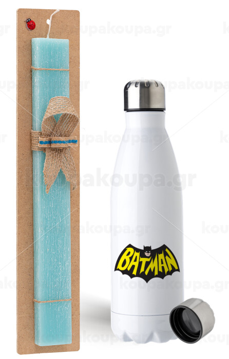 Batman classic logo, Πασχαλινή Λαμπάδα με μεταλλικό παγούρι ανοξείδωτο (750ml) & κερί αρωματικό πλακέ (30cm) (ΤΙΡΚΟΥΑΖ)
