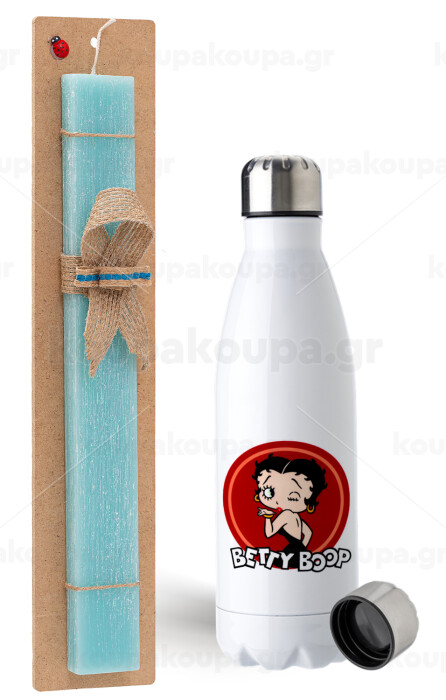 Betty Boop kiss, Πασχαλινή Λαμπάδα με μεταλλικό παγούρι ανοξείδωτο (750ml) & κερί αρωματικό πλακέ (30cm) (ΤΙΡΚΟΥΑΖ)