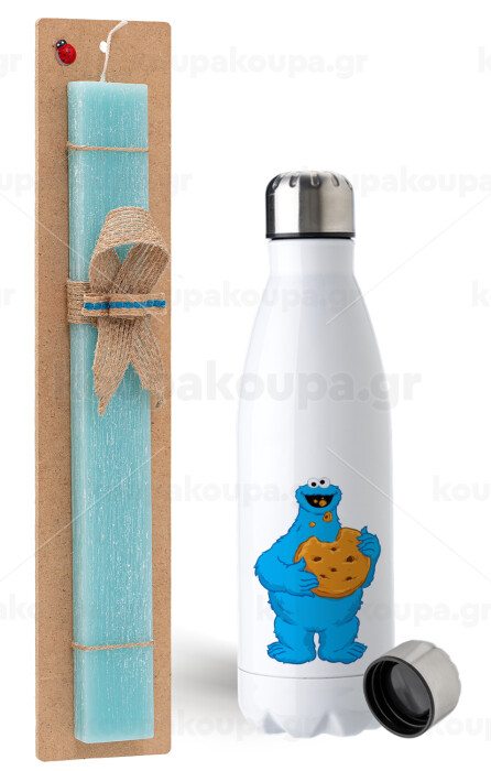 Cookie Monster, Πασχαλινή Λαμπάδα με μεταλλικό παγούρι ανοξείδωτο (750ml) & κερί αρωματικό πλακέ (30cm) (ΤΙΡΚΟΥΑΖ)