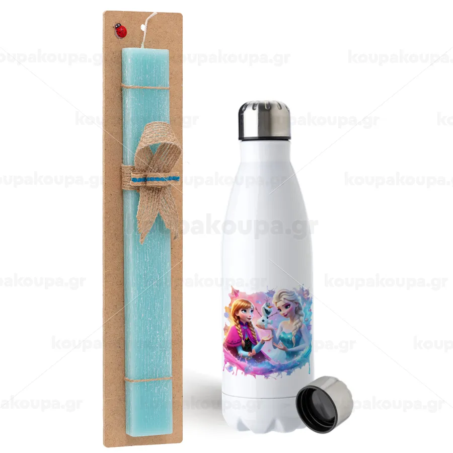 Έλσα & Άννα, Πασχαλινή Λαμπάδα με μεταλλικό παγούρι ανοξείδωτο (750ml) & κερί αρωματικό πλακέ (30cm) (ΤΙΡΚΟΥΑΖ)