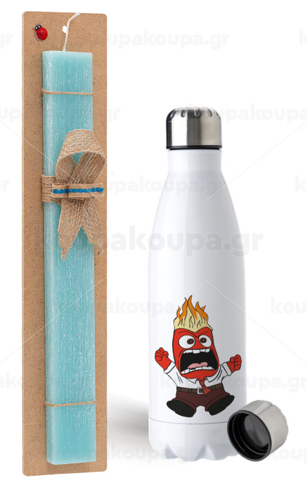 Inside Out θυμός, Πασχαλινή Λαμπάδα με μεταλλικό παγούρι ανοξείδωτο (750ml) & κερί αρωματικό πλακέ (30cm) (ΤΙΡΚΟΥΑΖ)