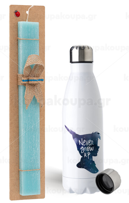 Never Grow UP, Πασχαλινή Λαμπάδα με μεταλλικό παγούρι ανοξείδωτο (750ml) & κερί αρωματικό πλακέ (30cm) (ΤΙΡΚΟΥΑΖ)