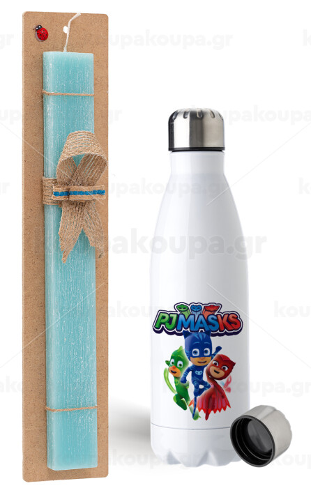 PJ masks, Πασχαλινή Λαμπάδα με μεταλλικό παγούρι ανοξείδωτο (750ml) & κερί αρωματικό πλακέ (30cm) (ΤΙΡΚΟΥΑΖ)