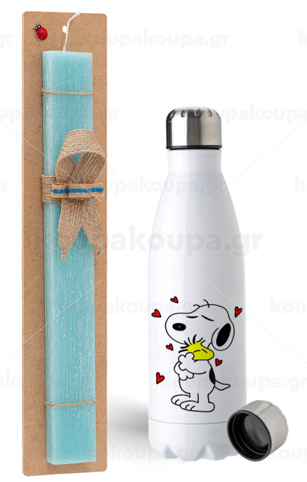 Snoopy Love, Πασχαλινή Λαμπάδα με μεταλλικό παγούρι ανοξείδωτο (750ml) & κερί αρωματικό πλακέ (30cm) (ΤΙΡΚΟΥΑΖ)