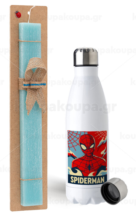 Spiderman kid, Πασχαλινή Λαμπάδα με μεταλλικό παγούρι ανοξείδωτο (750ml) & κερί αρωματικό πλακέ (30cm) (ΤΙΡΚΟΥΑΖ)