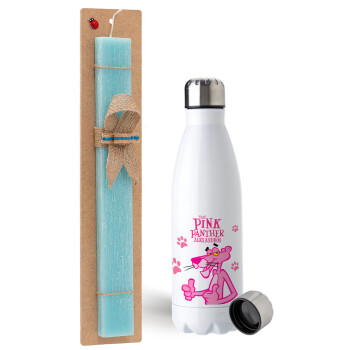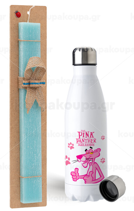 The pink panther, Πασχαλινή Λαμπάδα με μεταλλικό παγούρι ανοξείδωτο (750ml) & κερί αρωματικό πλακέ (30cm) (ΤΙΡΚΟΥΑΖ)