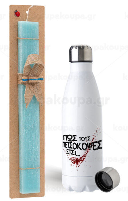 Πως τους πετσόκοψες έτσι..., Πασχαλινή Λαμπάδα με μεταλλικό παγούρι ανοξείδωτο (750ml) & κερί αρωματικό πλακέ (30cm) (ΤΙΡΚΟΥΑΖ)