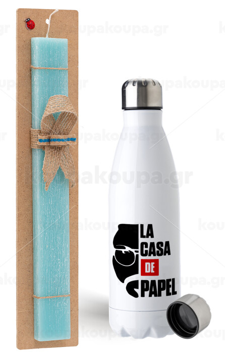 La casa de papel, Πασχαλινή Λαμπάδα με μεταλλικό παγούρι ανοξείδωτο (750ml) & κερί αρωματικό πλακέ (30cm) (ΤΙΡΚΟΥΑΖ)