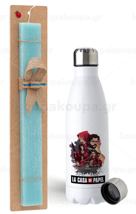 La casa de papel drawing cover, Πασχαλινή Λαμπάδα με μεταλλικό παγούρι ανοξείδωτο (750ml) & κερί αρωματικό πλακέ (30cm) (ΤΙΡΚΟΥΑΖ)