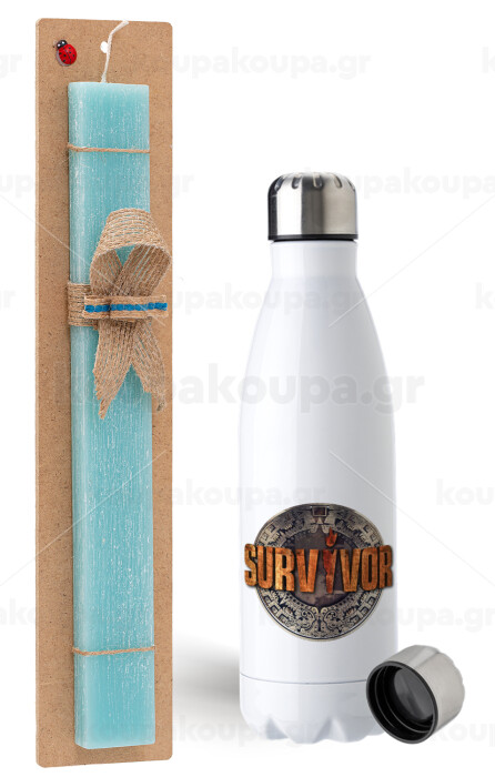 Survivor, Πασχαλινή Λαμπάδα με μεταλλικό παγούρι ανοξείδωτο (750ml) & κερί αρωματικό πλακέ (30cm) (ΤΙΡΚΟΥΑΖ)