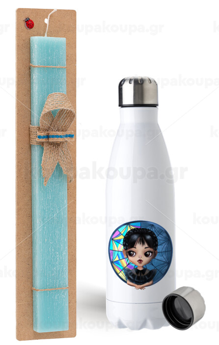 Wednesday big eyes, Πασχαλινή Λαμπάδα με μεταλλικό παγούρι ανοξείδωτο (750ml) & κερί αρωματικό πλακέ (30cm) (ΤΙΡΚΟΥΑΖ)
