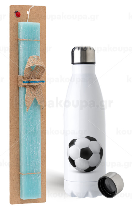 Μπάλα ποδοσφαίρου, Πασχαλινή Λαμπάδα με μεταλλικό παγούρι ανοξείδωτο (750ml) & κερί αρωματικό πλακέ (30cm) (ΤΙΡΚΟΥΑΖ)