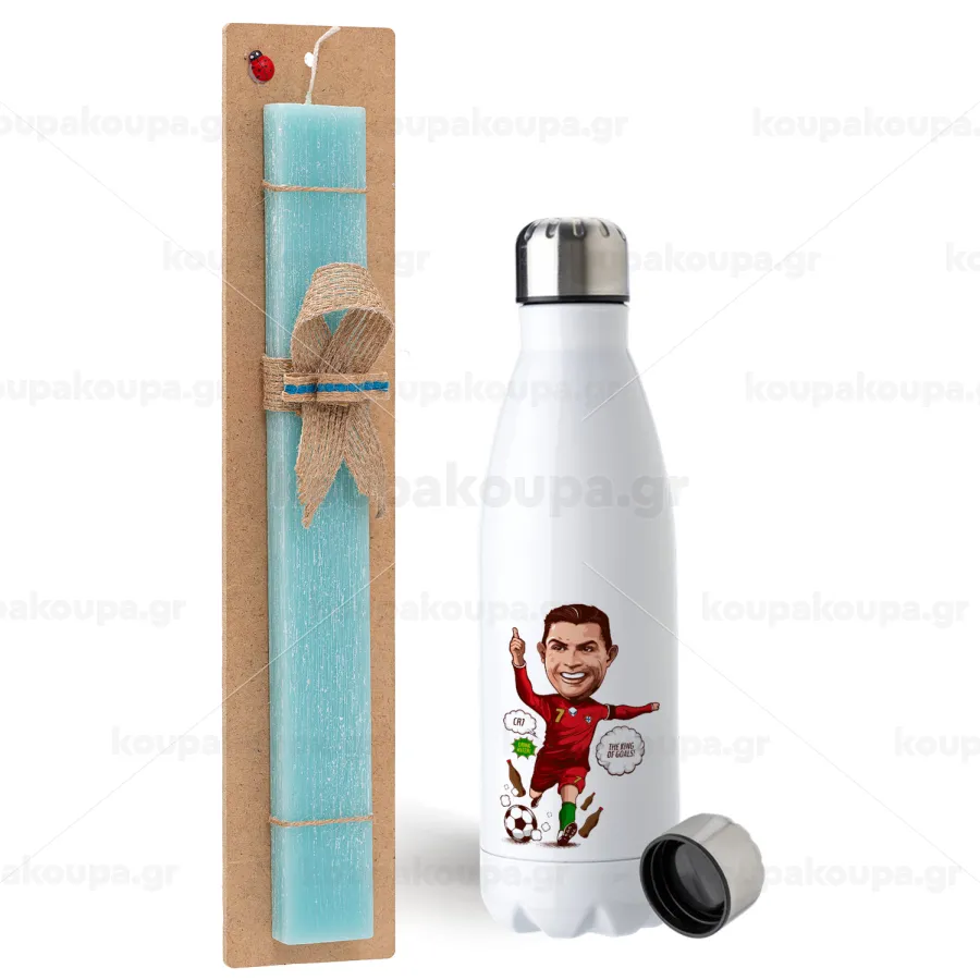 Cristiano Ronaldo, Πασχαλινή Λαμπάδα με μεταλλικό παγούρι ανοξείδωτο (750ml) & κερί αρωματικό πλακέ (30cm) (ΤΙΡΚΟΥΑΖ)